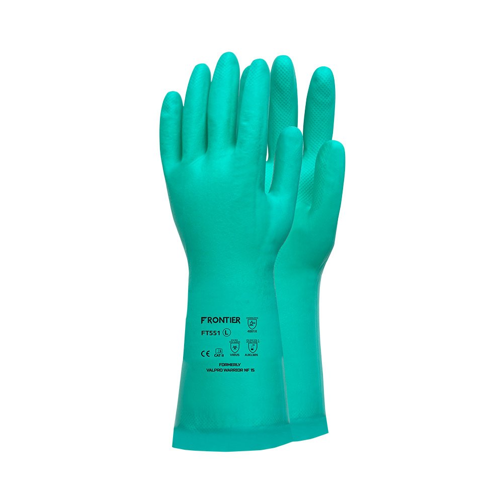 Introducing the Frontier Nitrile Green Gloves FT551, your go-to solution for safe handling of oil-based chemicals and solvents. These lightweight, reusable cut-resistant gloves feature an overlapped diamond pattern for exceptional grip in wet or oily conditions. Designed for optimal flexibility and dexterity, they ensure comfortable working experiences while providing good abrasion resistance for handling coarse objects. The cotton flock lining enhances comfort, making them suitable for extended wear. Certified to EN 388:2016 and EN ISO 374-1/5, these safety hand gloves are ideal for chemical processing, degreasing, light assembly, and food processing, including meat and poultry tasks.